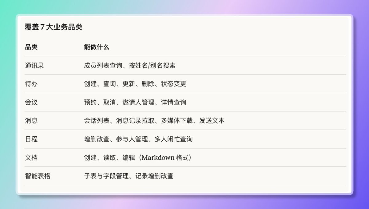 开放企业微信消息、日程、文档、智能表、会议、待办、通讯录等核心产品能力