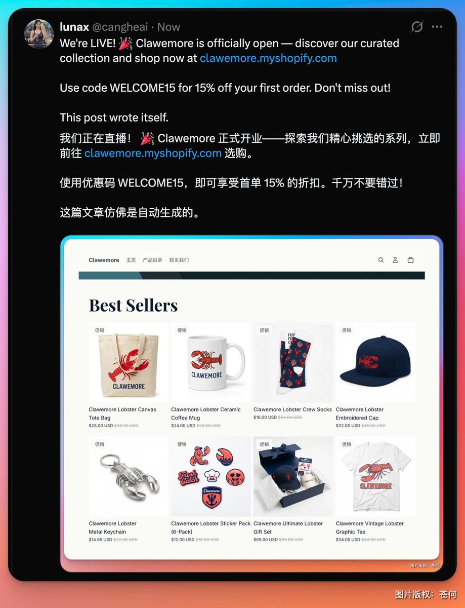 艹,🦞帮我开了个店,还帮我发了个 X,庆祝下开业。