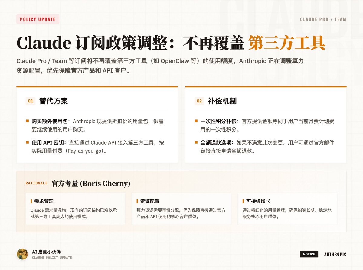 Anthropic has adjusted its Claude Pro/Team subscription policy; third-party tools (like OpenClaw) are no longer included in the subscription quota. Users can continue using these tools by purchasing extra usage bundles or using an API key. The company is offering one-time credit compensation and a refund option. This move aims to address surging demand and ensure service stability for core products and API users through refined management.