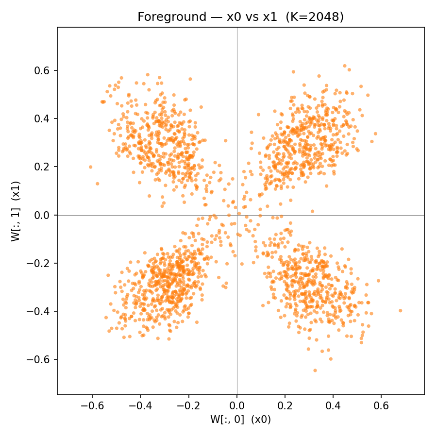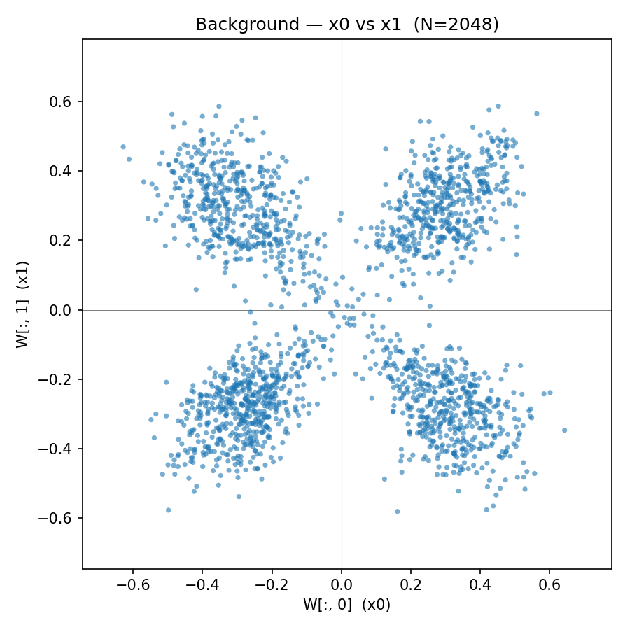 In this setting we look at a 2-layer model that takes in a two-dimensional input variables and is trained on the target at a large width (here ) and on infinite data. The activation function is a bounded sigmoid-like function (the relu version of tanh). Each neuron at layer 1 is a function that only depends on a 2-dimensional row of the weight matrix, so the associated "test" field or particle can be plotted on a 2-dimensional graph. When we plot all of these together we get a good picture of the distribution of single-neuron functions that combine together to form the background system: