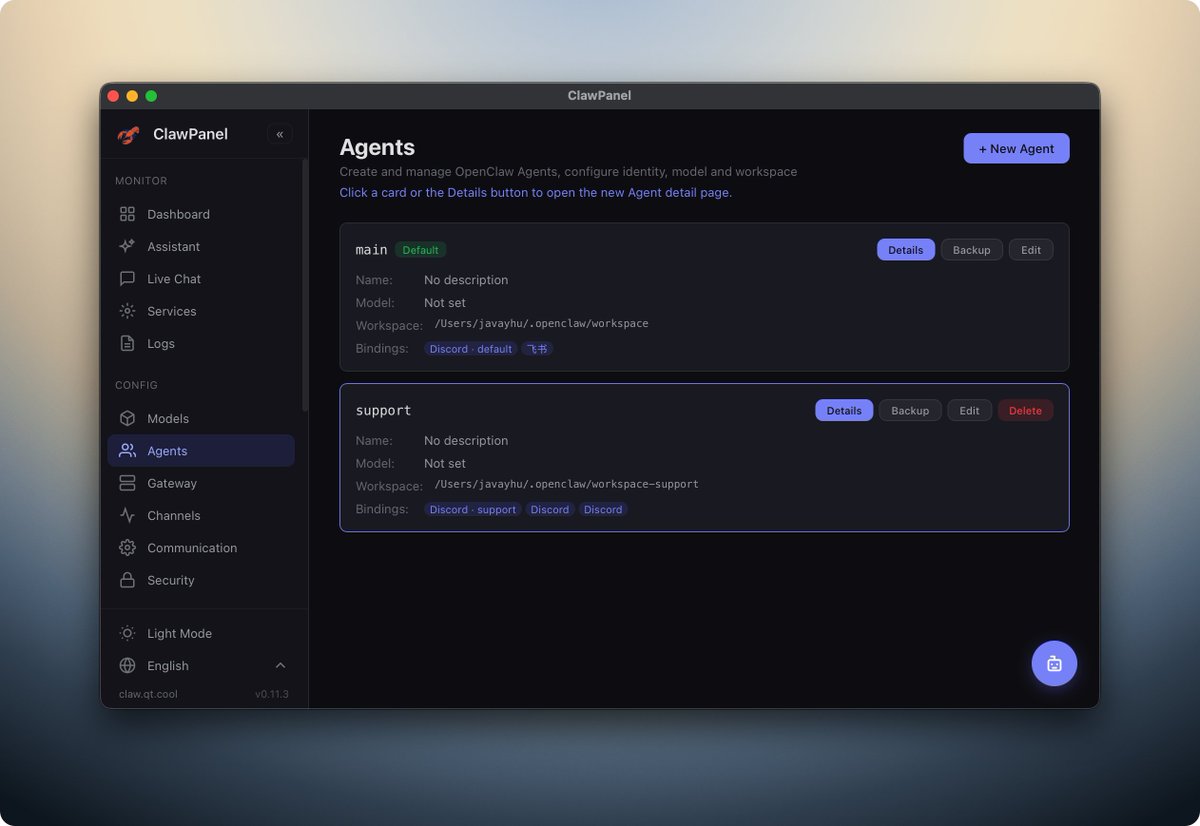 今天推荐的管理工具叫ClawPanel,开源免费,支持管理agents、channels、skills、jobs等,常用设置都gui操作,自动写到openclaw.json文件。工具支持备份配置文件,出了问题也方便查看日志和恢复