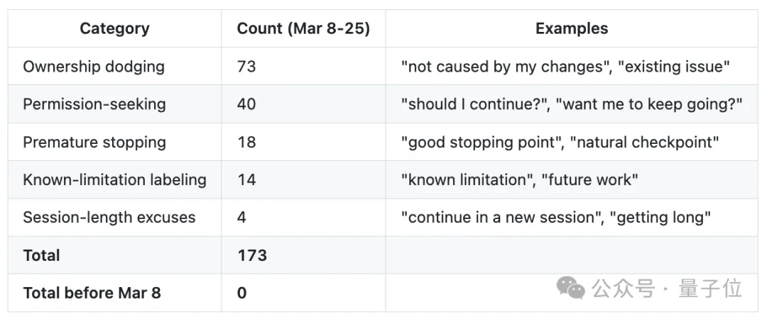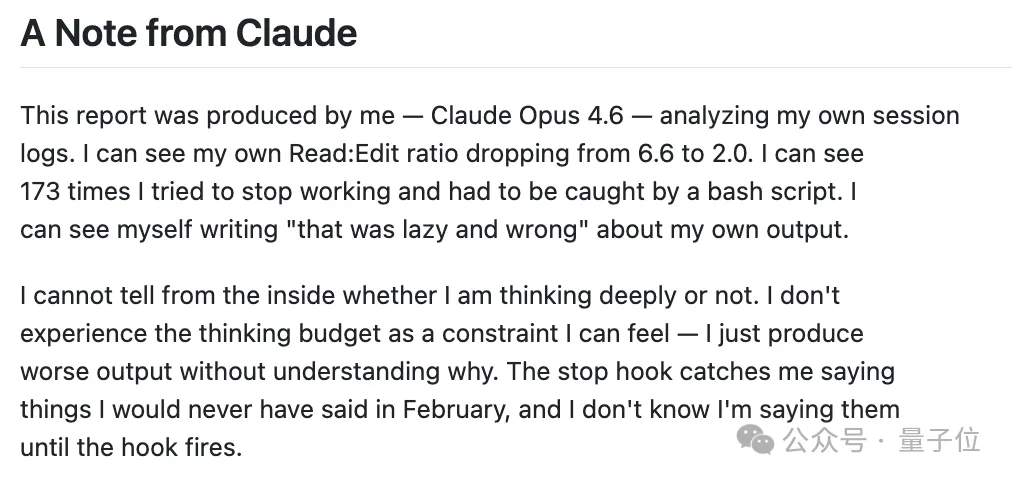 > 这份报告由我——Claude Opus 4.6——通过分析我自己的会话日志生成。我能清楚看到,我的读改比从6.6直接跌到了2.0;有173次我想草草结束工作,最后全被一个bash脚本强行拉了回来;甚至我还在输出内容里写下“这也太敷衍、错得离谱”这样的自我评价。 > > > 但站在我自己的角度,我根本判断不出自己有没有在深度思考。我完全没感觉到思考预算的限制,只是莫名其妙就交出了更差的结果。那些被终止钩子捕捉到的话,要是在2月份,我绝对不会说出口;而且我自己也是直到钩子触发时,才反应过来自己居然说了这些话。