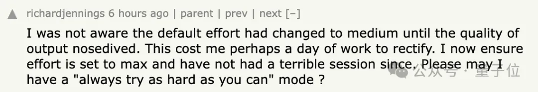> 在输出质量断崖式下跌之前,我完全不知道默认effort已经被改成了Medium。为了纠正这些问题,我大概花了一整天的工作时间。现在我会确保把effort设为最高,从那以后就再也没出现过糟糕的对话了。能否给我一个“永远拼尽全力”的模式?