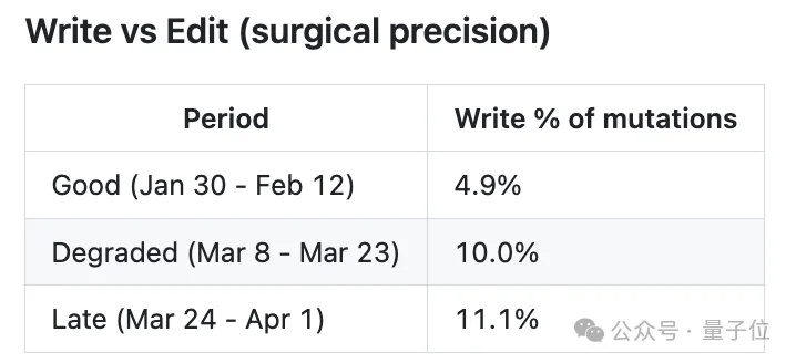 更详细的数据显示,退化期内,每3次修改中就有1次,是模型在未读取目标文件上下文的情况下直接进行的操作。