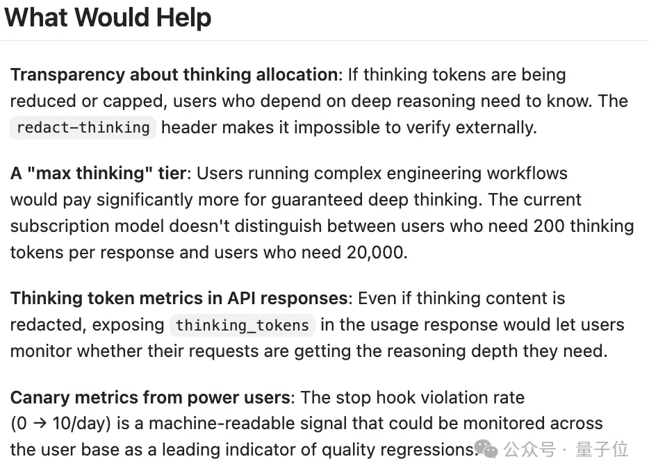 * 思考资源分配透明:如果思考token被削减或设置上限,依赖深度推理的用户有权知晓。redact-thinking头部配置,让用户无法从外部验证模型实际分配的推理深度。 * 满额思考专属档位:运行复杂工程工作流的用户,愿意为保证深度思考支付更高费用。当前的订阅模式,未对普通用户和重度工程师做区分,前者单次响应仅需200思考token,后者则可能需要20000。 * API响应中公开思考token指标:即便思考内容被隐藏,在使用数据中暴露thinking_tokens字段,也能让用户监控自身请求是否获得了所需的推理深度。 * 面向重度用户的监控指标:终止钩子违规率是一个灵敏的机器可读信号,可作为全用户群体的质量退化预警指标,提前发现问题。