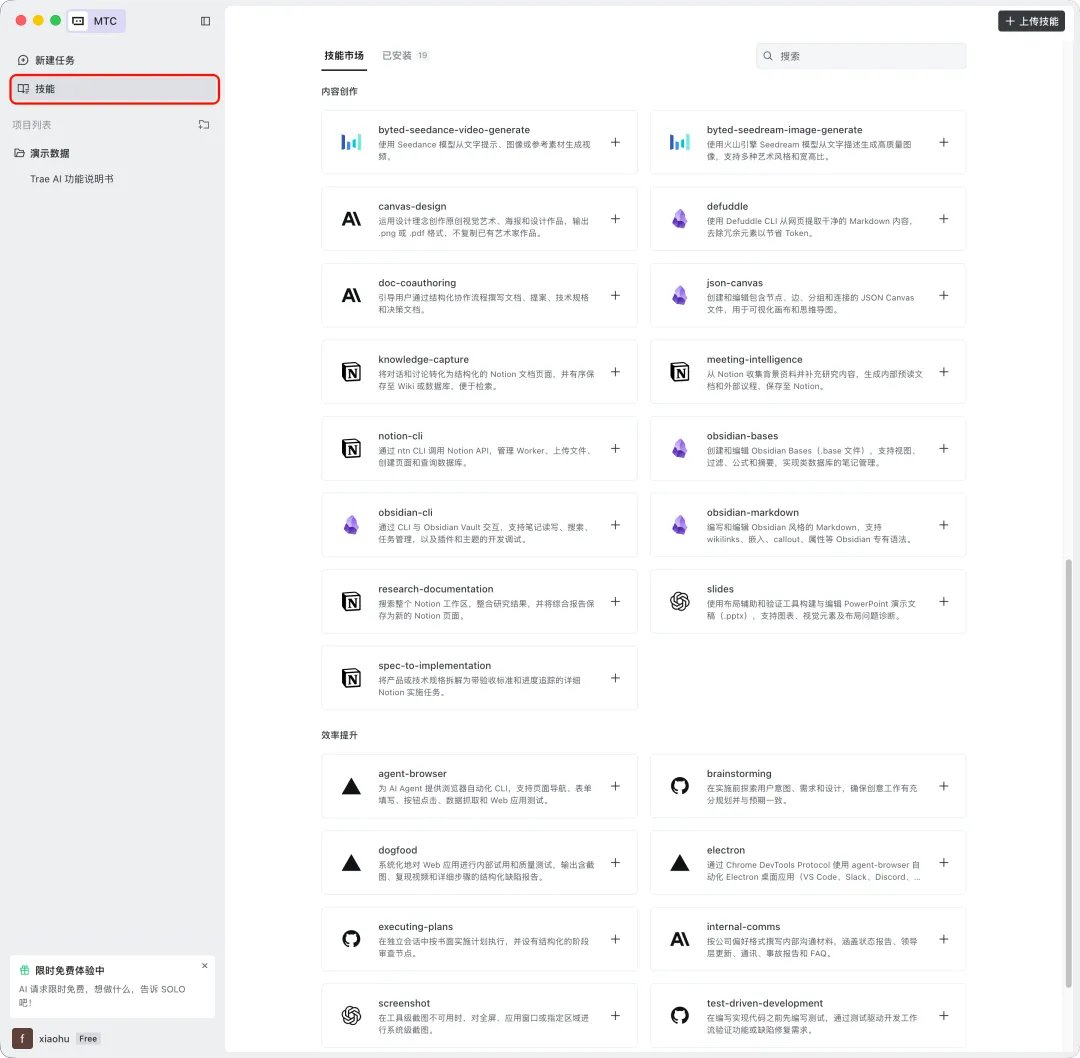 A follow-up on SOLO's Skill Market feature. Users can extend the AI's capabilities by installing Skills to handle repetitive tasks directly, eliminating the need to re-explain requirements every time, thereby enhancing the product's extensibility and usability.