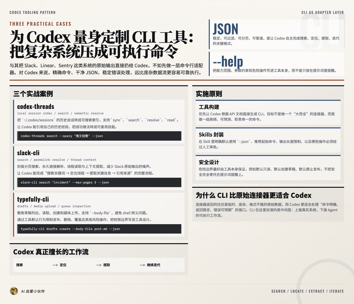 Codex 团队成员 @nickbaumann_ 指出:Codex 最擅长使用可表达为精确命令的工具,而非原始数据流或复杂的连接器。当面对 Slack、Linear、Sentry 等系统时,与其让 Codex 直接处理庞大、嘈杂、临时的原始输出,不如构建专门的命令行工具作为"中间层"。