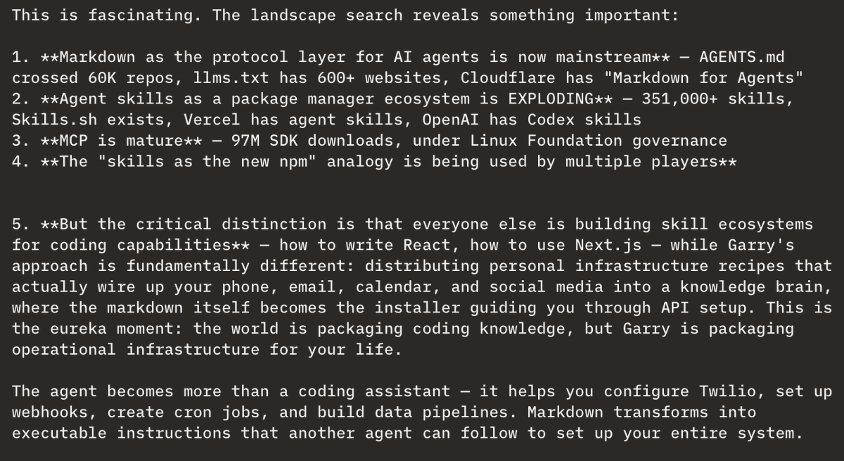 This tweet discusses the conceptual development of GBrain, using a combination of GStack and Claude Code. The focus is on creating an 'opinionated software distribution mechanism,' suggesting a shift toward automated, AI-driven software delivery and management within his personal tech stack.