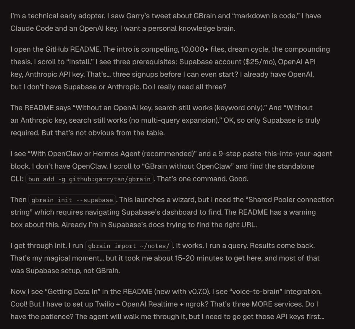 Garry Tan discusses the current state of AI agent infrastructure, specifically mentioning the integration of OpenClaw, GBrain, and LLM Knowledge Wikis. He acknowledges the current setup is frustratingly complex, drawing a historical parallel to the Altair BASIC era of computing. This suggests we are in the very early, unrefined stages of AI agent development where 'DevEx' (Developer Experience) is a critical bottleneck that needs to be solved.